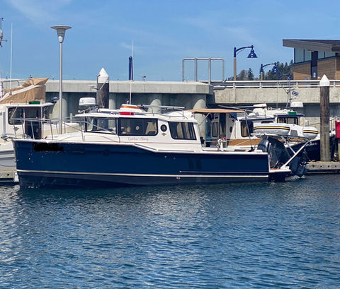 REDUCED! The 2023 Ranger Tug 27 stands out as a versatile and stylish cruiser, powered by a 300 HP outboard engine and equipped with advanced electronics for seamless navigation. Its spacious interior features a full galley, forced-air heating, and a convertible dinette, ensuring comfort for extended adventures. Compared to previous models, the 2023 version introduces wrap-around forward windows, which create panoramic like views from the saloon, a cleaver double-wide foldout bow seat, and improved cockpit seating aft. These updates, combine for added convenience and relaxation, making the updated R-27 a standout choice for modern boating enthusiasts.